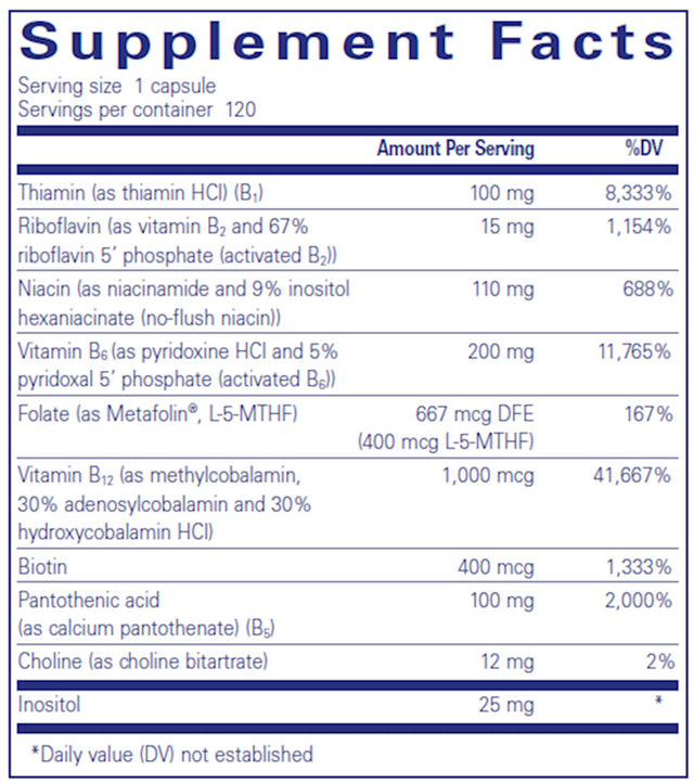 This broad-spectrum B vitamin formula from Pure Encapsulations is offered through our store to help support healthy neurological function, cognitive wellness, and overall metabolic balance. It provides bioactive and highly absorbable forms of B vitamins, including pyridoxal-5-phosphate, riboflavin-5-phosphate, and 5-MTHF folate, designed to help maintain normal methylation processes, promote nerve function, and support everyday energy metabolism. As a reseller, we provide this product exactly as supplied by the manufacturer, offering a reliable option for daily B vitamin support.
