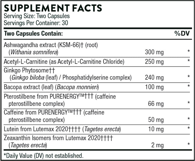 Thorne Memoractiv 60 combines carefully selected botanical extracts and essential nutrients to support cognitive performance, mental clarity, and visual wellness. This formulation is designed to help maintain focus and overall brain health while providing antioxidant support. It offers a premium blend of ingredients that work synergistically to promote general well-being and mental alertness.