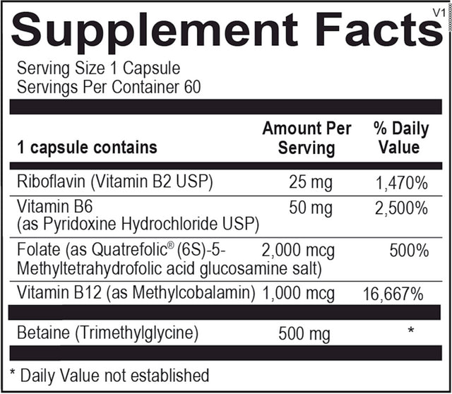 Dietary Supplement Methyl CpG is a comprehensive formula that includes targeted amounts of five key nutrients designed to aggressively support methylation and homocysteine balance in the body.* Methyl CpG provides high-concentration folate as Quatrefolic® - 100% 5-MTHF, the biologically active form, and trimethyl glycine. The formula includes key methylation vitamins B2, B6 and B12 (methylcobalamin). This specific blend of methyl donors supports methylation, homocysteine balance, neurotransmitter production, healthy hormone balance and optimal detoxification.*