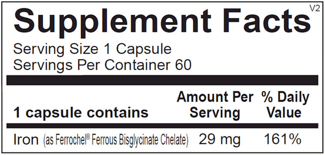 • Provides 29 mg elemental iron in a highly absorbable, gentle ferrous bisglycinate form