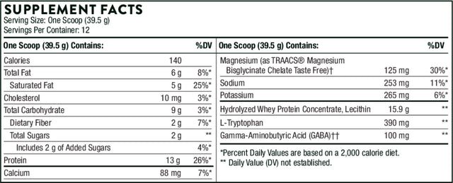 Thorne RecoveryPro Chocolate is a nutrient-rich supplement designed to support muscle repair, restful sleep, and overall recovery. It provides 13 grams of high-quality whey protein per serving to promote healthy muscle function. The formula combines tryptophan, magnesium bisglycinate, and PharmaGABA to support relaxation and maintain balanced mental function during rest. Additionally, it offers branched-chain amino acids and cysteine to assist in maintaining performance and recovery after exercise.