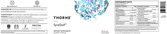 Thorne SynaQuell is a specialized formula designed to support overall brain wellness and cognitive function. It combines ketones, BCAAs, CoQ10 phytosome, DHA, and nicotinamide riboside (NR) to help maintain healthy neurotransmitter balance, mitochondrial function, and cellular energy. This supplement is crafted to complement daily nutrition and support general neurological health.